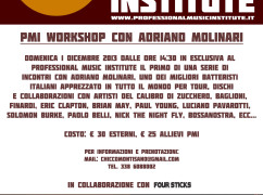 Sono aperte le iscrizioni per il Workshop di Adriano Molinari che si svolgerà Domenica 1 dicembre 2013 dalle ore 14:30 in esclusiva nella nuova sala PMI Lab. presso il Professional Music Institute in Via Rodano n° 13 a Reggio Emilia. Il primo di una serie di incontri con uno dei migliori batteristi italiani apprezzato in