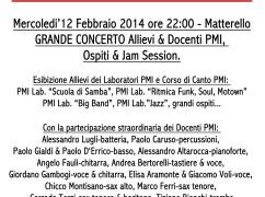 “PMI LAB. NIGHT LIVE” Mercoledi’12 Febbraio 2014 ore 22:00 – Matterello GRANDE CONCERTO Allievi & Docenti PMI, Ospiti & Jam Session. Esibizione Allievi dei Laboratori e Corso di Canto PMI: Lab. “Scuola di Samba PMI” Docente: Paolo Caruso PMI Lab. “Ritmica Funk, Soul, Motown” Docenti: Angelo Fauli, Paolo D’Eriico, Alessandro Lugli. PMI Lab. “Big Band”